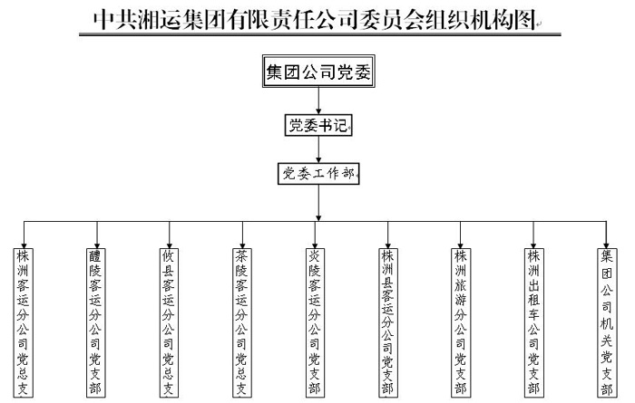 中共湘運(yùn)集團(tuán)有限責(zé)任公司委員會,隸屬于中共株洲市非公有制經(jīng)濟(jì)組織工委。黨委會常設(shè)工作機(jī)構(gòu)黨委工作部。全司共有中共黨員304名。下轄株洲客運(yùn)分公司黨總支、醴陵客運(yùn)分公司黨支部、攸縣客運(yùn)分公司黨總支、茶陵客運(yùn)分公司黨總支、炎陵客運(yùn)分公司黨支部、株洲縣客運(yùn)分公司黨支部、株洲旅游分公司黨支部、株洲出租車公司黨支部、集團(tuán)公司機(jī)關(guān)黨支部共9個二級基層黨組織。